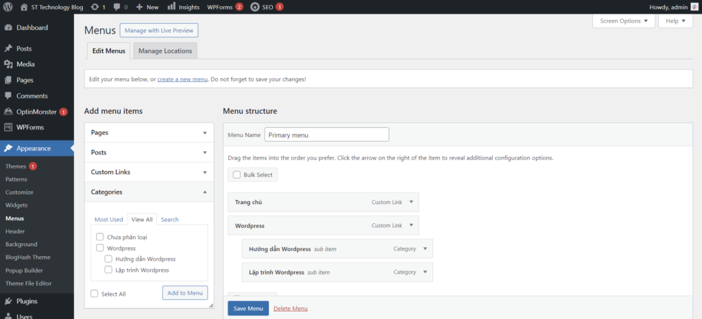 Menu trong WordPress là nơi bạn sẽ cần dùng đến cho những việc như: