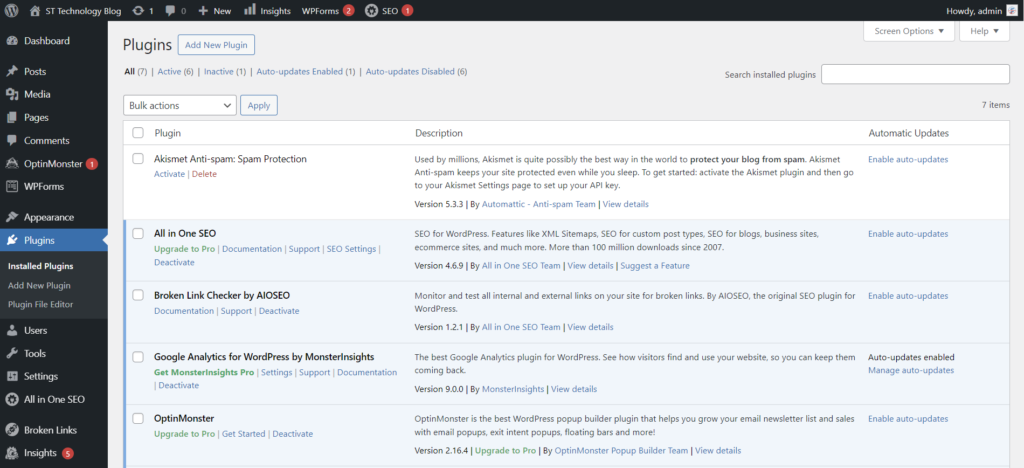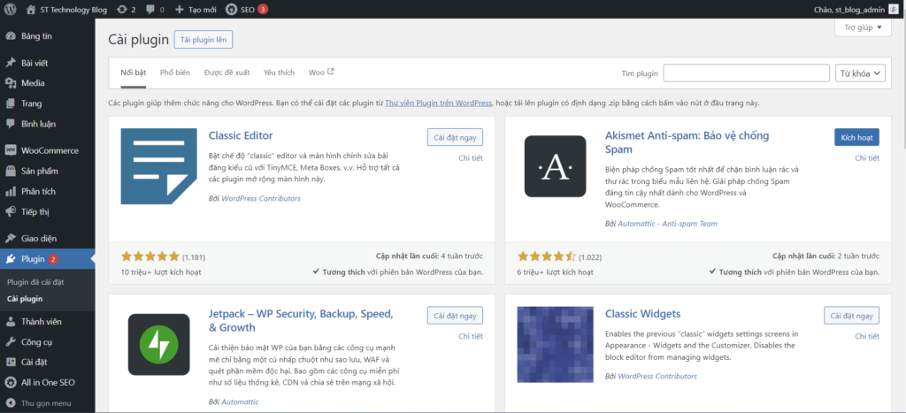 Để cài đặt plugins, từ giao diện quản trị, chọn mục “Plugin”. Từ đây, chúng ta sẽ thấy danh sách plugins đã được cài đặt và kích hoạt trên website.