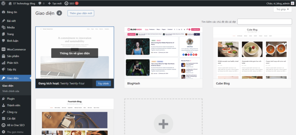 Từ giao diện quản trị, chúng ta có thể truy cập vào mục “Giao diện” (theme) để xem danh sách các themes đang sẵn có hoặc tải và cài đặt thêm theme cho website như ảnh minh họa.